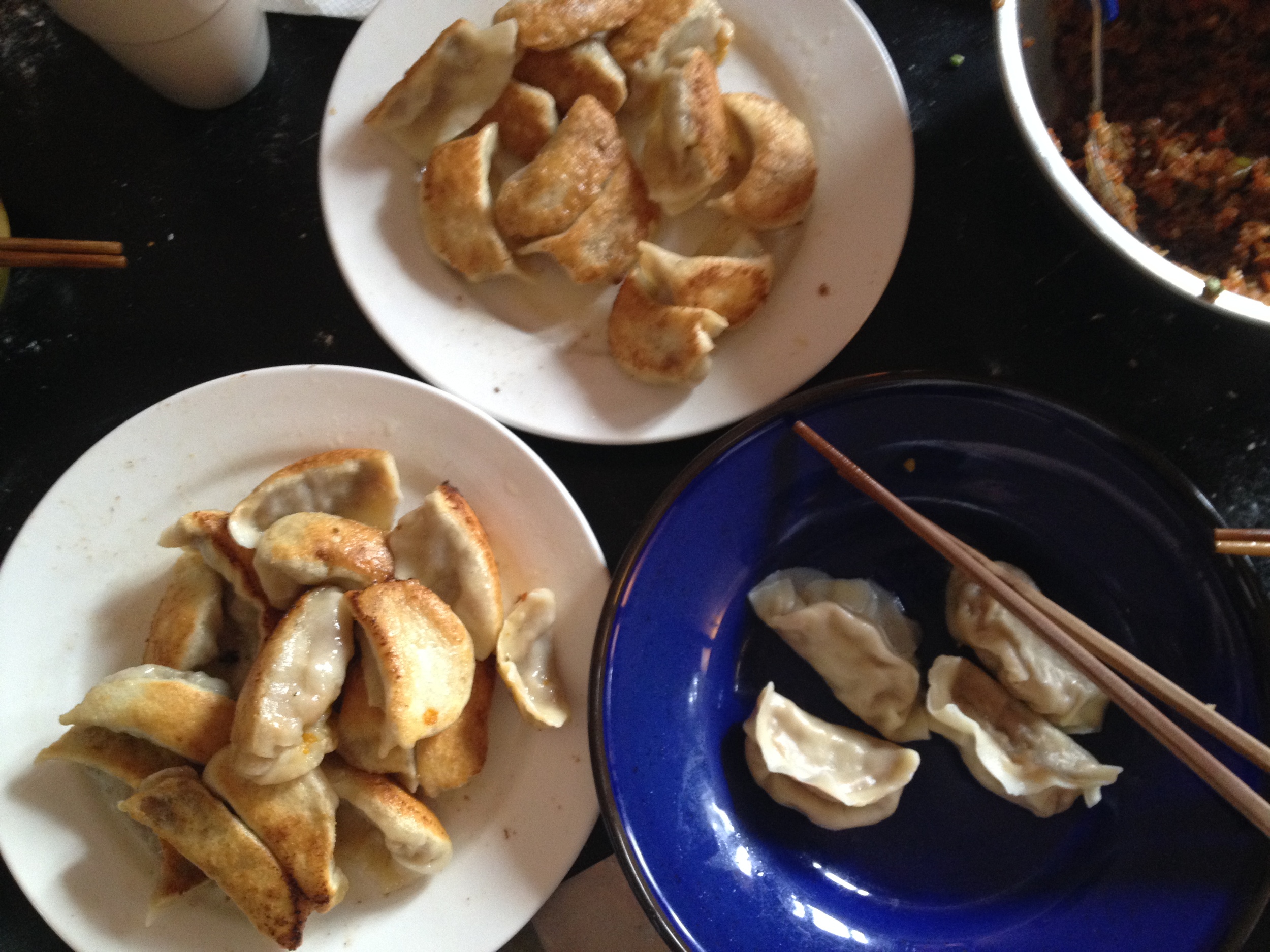 Now that both dumpling components were ready, we were taught the proper dumpling folding technique. I don't want to give away all of the great secrets to these wonderful treats, because I want to encourage everyone to visit the kitchen and experience the cooking class personally, but it was much simpler than I thought to make a perfect dumpling. While the students furiously folded the dumplings, BSK staff set to work steaming and boiling them in preparation for lunch. We feasted on our little creations while we continued to fill and fold future dumplings. After several rounds of fresh potsticker plates were brought out and the omnipresent píjiŭ was finished, the students said our goodbyes and thank-yous.