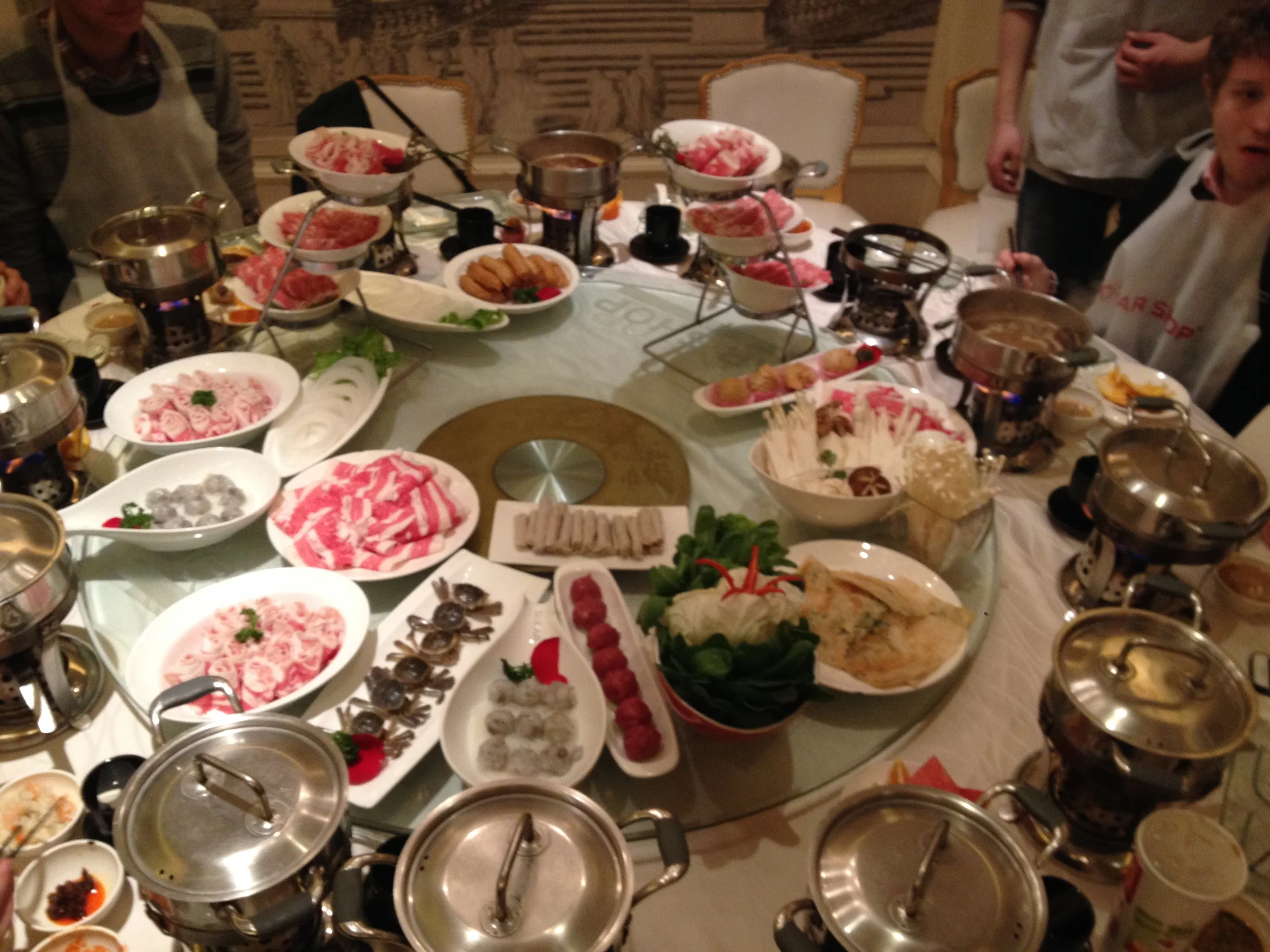 Several dining aspects differentiated this hotpot restaurant from the other one I ate at a few days prior. First, everyone at the table chose their own type of broth, instead of having one communal hotpot situated in the middle. I preferred the individual hotpot method because it allowed each person to control the level of their meal's heat. As someone who always likes things on the spicy side, I chose a Szechuan broth and made sure to grab a lot of chili oil from the sauce bar. As for ingredients, the staple mushrooms, greens, and meats made an extravagant appearance. Some of us ordered more unusual fare, like miniature crabs, shrimp puree, and these doughy-fried sticks that resembled churros. They were all so thoughtfully plated that it seemed a shame to eat! But eat we did. The plates of food came out so fast that they had to shelve the fresh ingredients in a little cupboard until we made more room on the table! Since no one consulted each other before ordering, we ended up with enough left over food to feed another fifteen hungry students. I felt bad wasting any of it (or maybe it was just so good) that I stuffed myself full.