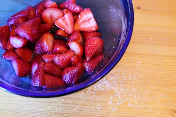 In our “system,” the solute is sugar, the solvent is the water within the strawberry, and the semipermeable membrane is the cellular walls of the strawberry. When strawberries are coated in sugar, there is a much higher concentration of solute outside of the strawberry than inside the strawberry. This causes our solvent (water) to flow out of the fruit and into the surrounding environment. The result is a delicious, syrupy, but not cloying sauce.