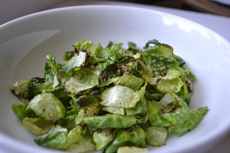 Heat about one Tbsp. oil in a large pan over high heat. Add half of the Brussels sprouts leaves, cooking until tender and lightly charred. Remove from pan and cook the other half of the sprouts the same way. Wipe pan and set aside charred leaves.