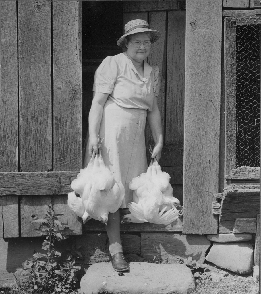 What jumps out immediately is the strange entanglement between the chickens and the women who slaughter them. Underneath an image of women in bandanas, victory curls, and immaculate floral aprons who are cradling white hens, the copy reads, “Once a year, friends and family of Marion Acres gather up all the girls to do what we like to call our ‘Ladies’ Chicken Harvest.” It’s strikingly unclear if they’re referring to the chickens or the women. What “girls” are they gathering up? And who, in fact, is being harvested?